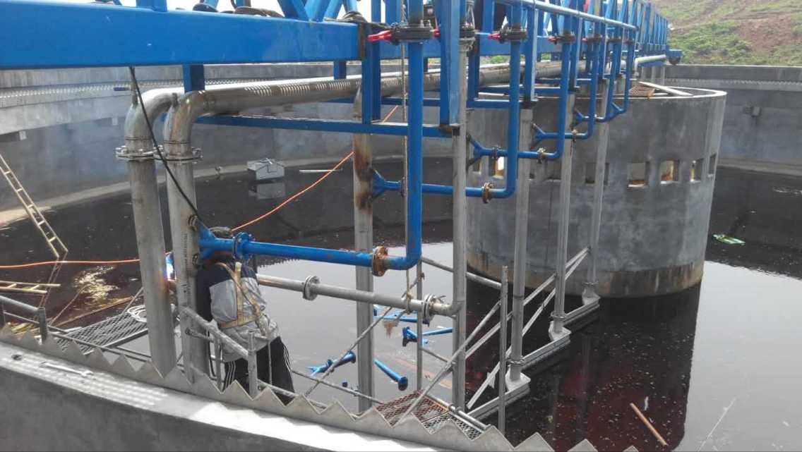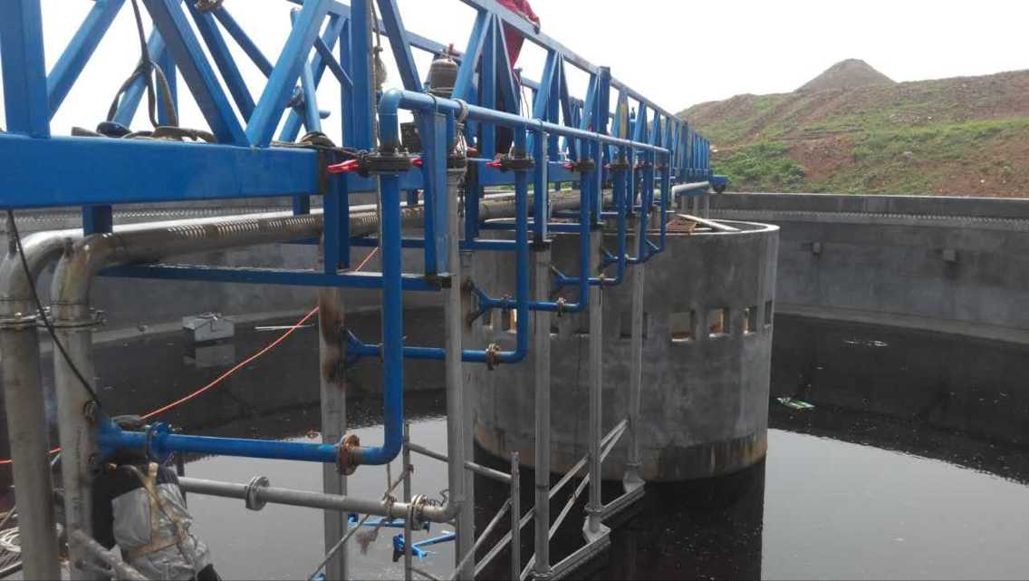 驅動裝置帶動刮泥機繞沉淀池中心旋轉,原水經沉淀池沉淀后,上清液從溢流堰板排出,沉淀于池底的污泥,在對數螺旋曲線形刮板的推動下,緩慢地沿池底流向中央集泥槽內,通過排泥管排出。同時池面浮渣集中到浮渣刮板和浮渣擋板之間的區域,當工作橋經過浮在池面的浮渣排出筒時,浮渣排出筒被壓到液面下,浮渣通過排出筒排出池外。