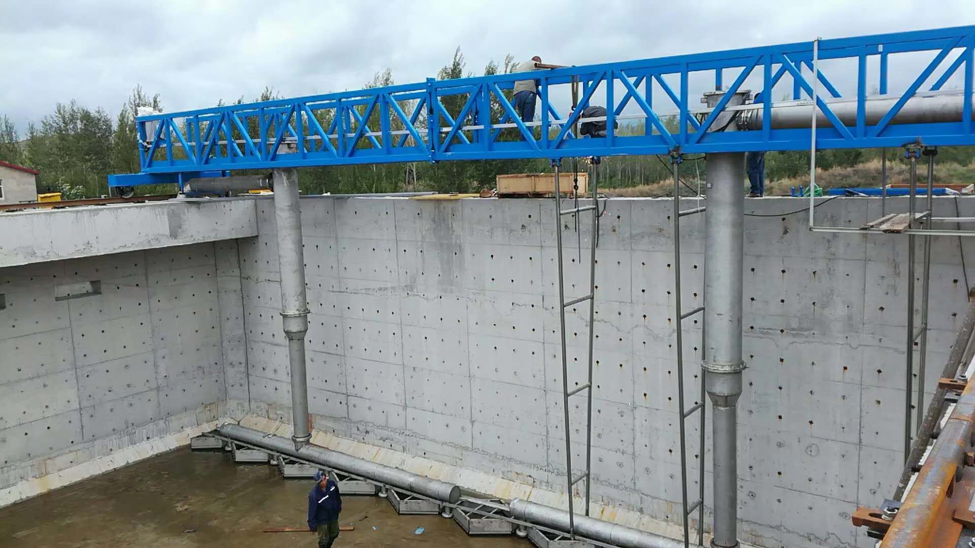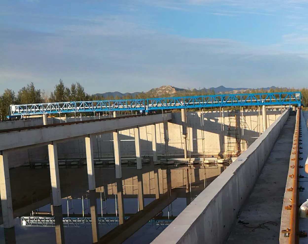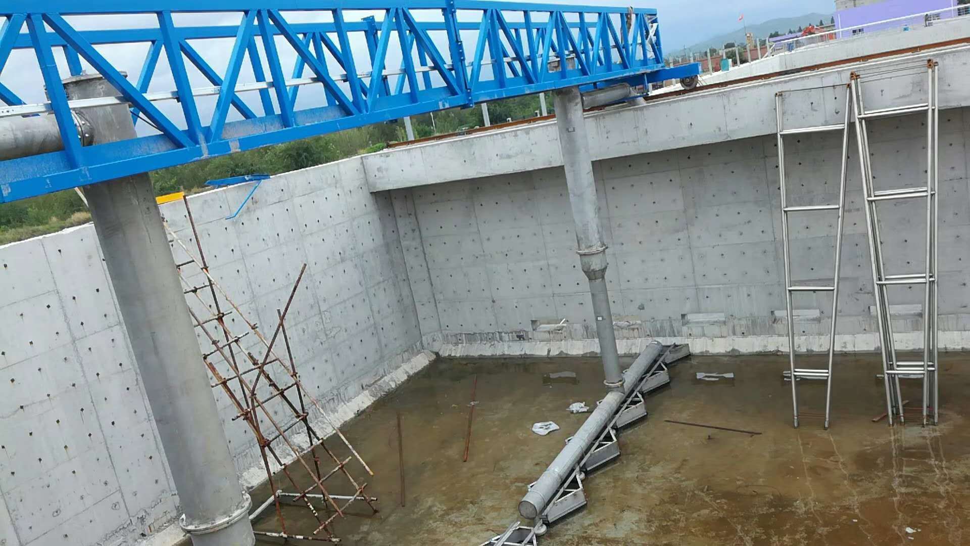 行車式刮泥機將沉降在池底的污泥刮集至集泥槽,并將池面的浮渣撇向集渣槽。可根據用戶的要求設置浮渣刮板。按水流方向,可分為逆向刮泥逆向排渣和逆向刮泥同向排渣方式。刮泥機構在不刮泥回程時刮泥耙全部抬起。當回到刮泥的起始位置時,刮泥耙落下,這樣周而復始的工作。