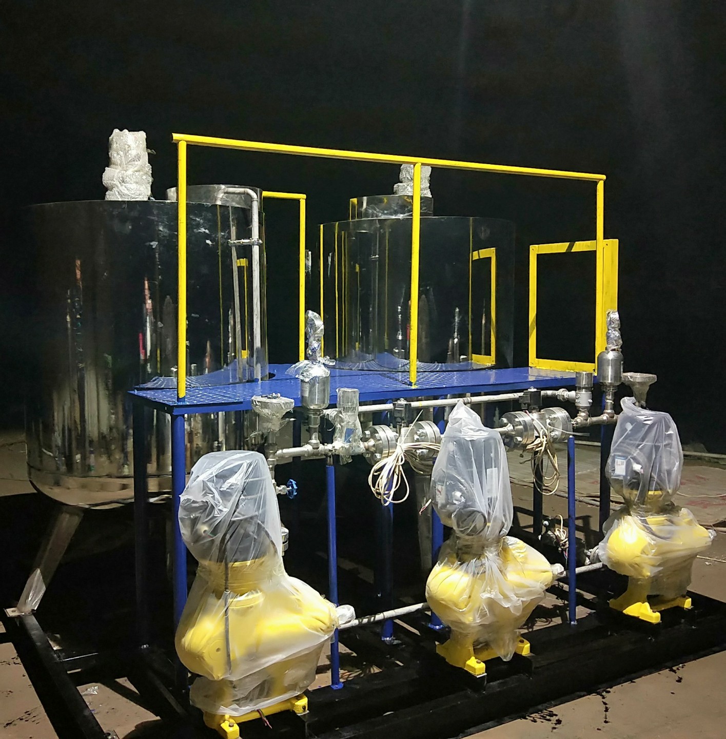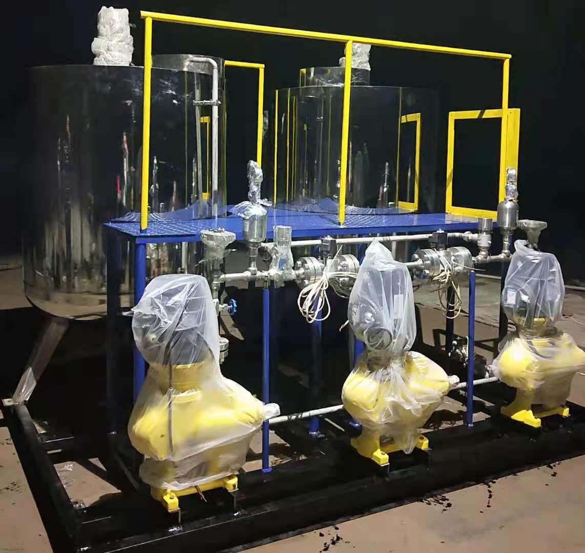自動加藥裝置,主要有溶液箱、攪拌機、計量泵、Y型過濾器、安全閥、背壓閥、止回閥、脈沖阻尼器、水位表、壓力表、控制柜、安裝平臺等組成一體化安裝在一個底座上。用戶只需將組合式加藥裝置安放在加藥間,將加藥管接好接通電源即可啟動投入運行,在運行過程中自動檢測流體的酸堿度智能判斷并加投相應的藥液,這種工廠化的整套裝置,可大大減少設(shè)計和現(xiàn)場施工的工作量,基本實現(xiàn)無人看管,對整機的質(zhì)量、安全和現(xiàn)場投運提供了可靠的保證。